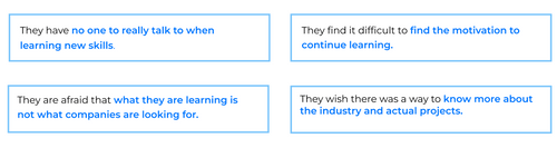 Users who pick up courses tend to drop them because they are held back by the lack of support, uncertainty when transitioning into a new industry, and the feeling of loneliness in the process.